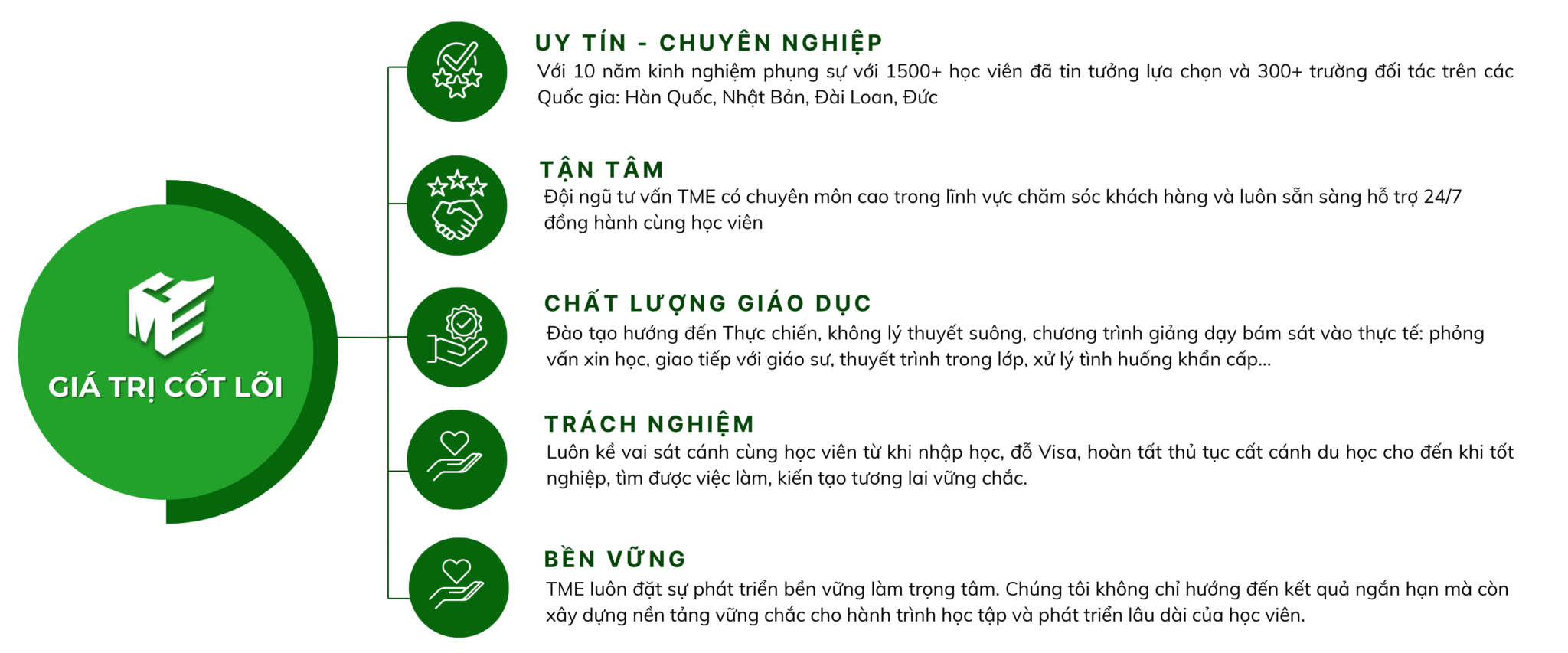 Du Học Thanh Mai – Hay còn được biết đến là Thanh Mai Education (TME) tự hào là đại diện tuyển sinh chính thức của 300+ trường Đại học, Cao đẳng và Trung học danh tiếng tại các điểm đến du học hàng đầu như Nhật Bản, Hàn Quốc, Đài Loan và CHLB Đức. Với bề dày kinh nghiệm và uy tín được xây dựng qua nhiều năm hoạt động trong ngành giáo dục quốc tế, TME không chỉ đơn thuần là cầu nối giữa học sinh Việt Nam và các trường quốc tế, mà còn là người đồng hành tin cậy, sát cánh cùng từng học viên trên con đường chinh phục ước mơ du học.
